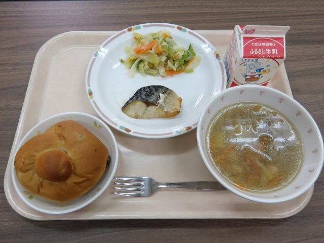ぶどうパン さばのレモンソースかけ 野菜スープ 春野菜のサラダ 牛乳