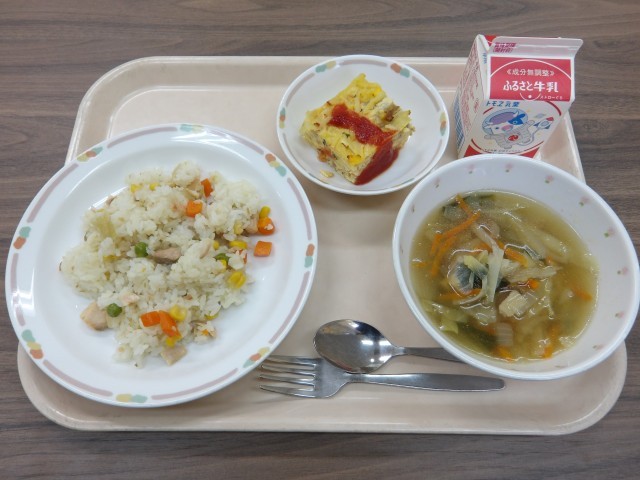 鮭ピラフ スパニッシュオムレツ せん切り野菜のスープ 牛乳