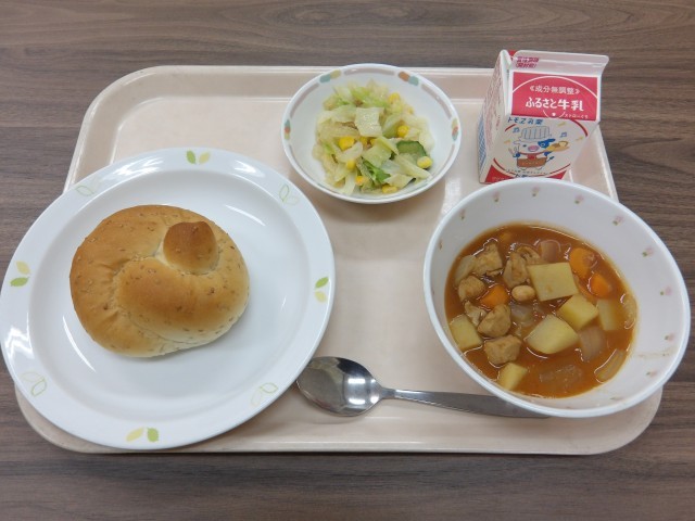 セサミパン ビーンズシチュー コーンサラダ 牛乳
