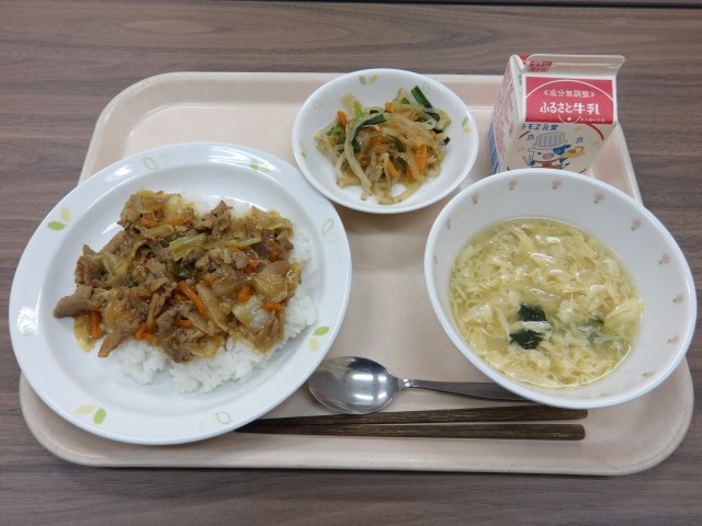 プルコギ丼 塩ナムル たまごスープ 牛乳