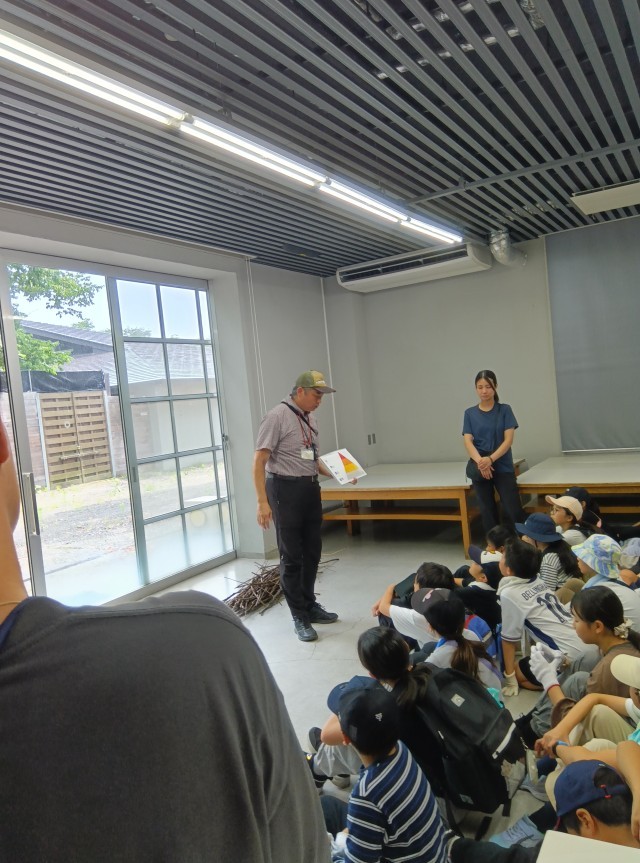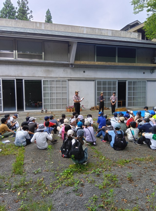 午後は里山体験プログラムです。最初はビレッジ前で行う予定でしたが、雨が降ってきたため、室内で始めています。