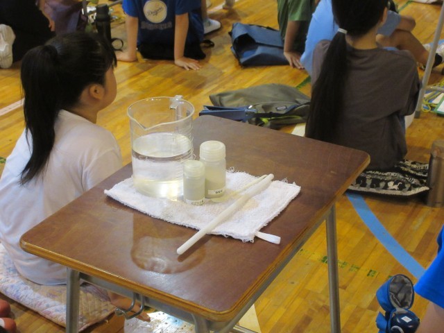 汚水をろ過して、水道水ができるまでの過程を実験しています。