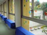 中町の町の樹木もだんだんと紅葉が始まりました。中学校との渡り廊下のガラスにも、色...