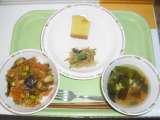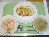 今日の献立は、天津丼、牛乳、豆腐しゅうまい、野菜のザーサイあえ、中華スープです...