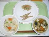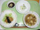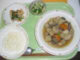 今日の献立は、里いもごはん、牛乳、わかさぎのから揚げ、野菜のゴマ酢かけ、のっぺ...