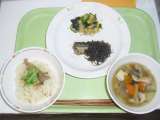 今日の献立は、まいたけごはん、牛乳、さんまの松前煮、野菜のしょうがじょうゆかけ...
