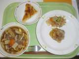 今日の献立は、ごはん、牛乳、れんこんのごまあえ、茶碗蒸し、とり肉と里いものうま...