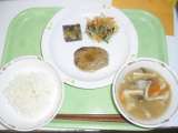 今日の献立は、ごはん、牛乳、むろあじハンバーグ、糸寒天と野菜のあえ物、きのこの...