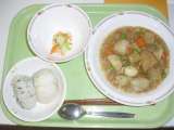 今日の献立は、わかめのおにぎり、肉みそおにぎり、牛乳、白菜の浅漬け、里いものそ...