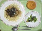 今日の給食は、牛乳、大根おろしスパゲッティ、ワカメ入りおひたし、かぼちゃのマフィ...
