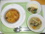 今日の献立は、ドリア、牛乳、ベーコンと野菜のスープ煮、小松菜サラダ、りんごです...