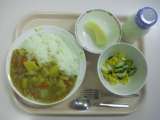 【献立】 こんにゃく入りカレーライス 牛乳 白菜とコー...
