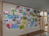 図工室前掲示版には、6年生の作品が掲示されています。平面作品ですが、立体アート...