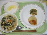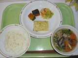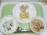 今日の献立は、わかめごはん、牛乳、五目卵焼き。里いものごまみそ煮、石狩汁です。...
