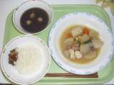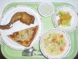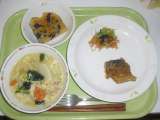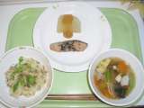 今日の献立は、深川めし、牛乳、鮭の南部焼き、ふろふき大根、のっぺい汁です。深川...