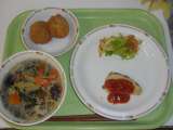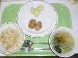 今日の献立は、クッパ、牛乳、韓国風サラダ、じゃがいももち、りんごです。クッパは...