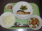 今日の献立は、ごはん、牛乳、鮭のみそ焼き、野菜のおかかあえ、めかぶ汁、わらびも...
