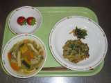 今日の献立は、ほうとう、牛乳、かき揚げ、わかめ入りおひたし、いちごです。 ほう...
