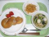 今日の献立は、シナモン揚げパン、牛乳、春雨スープ、スパイシーポテト、いちごです...