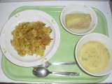 今日の献立は、カレーライス、牛乳、こんにゃくサラダ、米粉マカロニ入りフルーツポ...