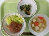 今日の献立は、牛乳、ごはん、ぶりの照り焼き、ほうれんそうの乾物和え、里芋の甘辛煮...