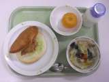 【献立】 チキンカツサンド 牛乳 ベーコンと野菜のスー...