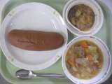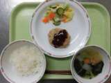 今日の献立は、牛乳、ごはん、ハンバーグ、ポテト入りフレンチサラダ、洋風スープです...