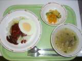 今日はハワイ料理の給食です。献立は、ロコモコ丼、牛乳、フルーツサラダ、ハワイア...