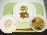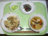 今日の献立は、豚肉とごぼうのごはん、牛乳、磯香あえ、五目汁、ずんだ白玉です。ず...
