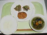 今日の献立は、ごはん、牛乳、ホキのヤンニョンジャンかけ、ナムル、チャプチエ、 ...