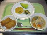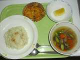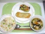 今日の献立は、チャーハン、牛乳、春巻き、野菜ときくらげのサラダ、ニラ玉スープで...