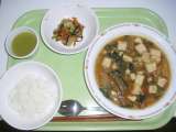 今日の献立は、ごはん、牛乳、四川豆腐、野菜の塩こんぶあえ、さつまいもの水ようか...