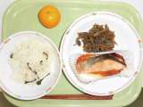 今日の献立は、牛乳、菜飯、魚のみそマヨネーズ焼き、きんぴらごぼう、冷凍みかんです...