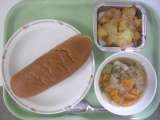 今日の献立は、牛乳、黒砂糖パン、ポテトグラタン、田舎風スープです。 今日使用の...