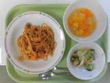今日の献立は、牛乳、スパゲッティ地中海ソース、フレンチサラダ、フルーツポンチです...