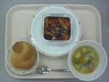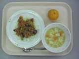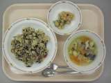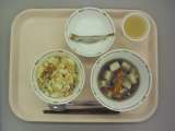 【献立】 ひじきピラフ 牛乳 ベーコンと野菜のスープ煮...