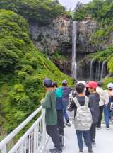 華厳の滝に到着しました。雨があまり降っていないので、水量は少なめでしたが、迫力...
