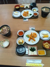 みんなと食べる夕食です。友達と楽しく食べていました。