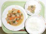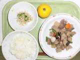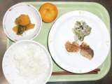 今日の献立は、牛乳、ごはん、鶏肉と里芋のうま煮、きゅうりともやしのごま風味、みか...