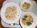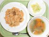 今日の献立は、牛乳、チキンライス、白いんげん豆の田舎風スープ、コーンサラダです。...