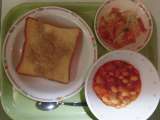 今日の献立は、牛乳、セサミトースト、ポークビーンズ、パリパリサラダです。 今日...