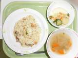 今日の献立は、牛乳、チャーハン、春雨サラダ、ワンタンスープです。 今日使用の食...