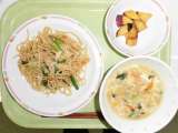 今日の献立は、牛乳、塩焼きそば、やきいも風、中華風コーンスープです。 今日使用...