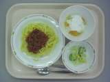 【献立】 スパゲッティミートソース 牛乳 コーンサラダ...