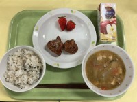 今日の献立わかめごはん 鶏肉の唐揚げ 豚汁 いちご りんごジュース今日は6年3組が家庭科の授業で考えた献立「人気のメニュー盛りだくさん給食!!」です。