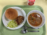 今日の献立丸パン メンチカツ キャベツ ミネストローネ 牛乳丸パン、メンチカツ、キャベツ、ミネストローネはそれぞれ6年生が家庭科の授業で考えたメニューです。今日のメンチカツは焼いて作りました。