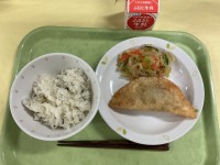 今日の献立しらすとわかめのごはん ジャンボぎょうざ 春雨サラダ 牛乳