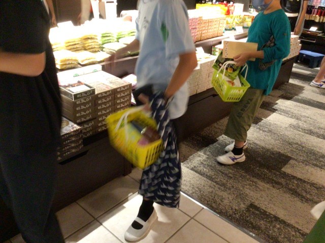 家族の人に喜んでもらおうと値段と相談しながら、しぶい漬物やガトーショコラなどを購入していました。子どもたちセレクトのお土産を楽しみに待っていてください。