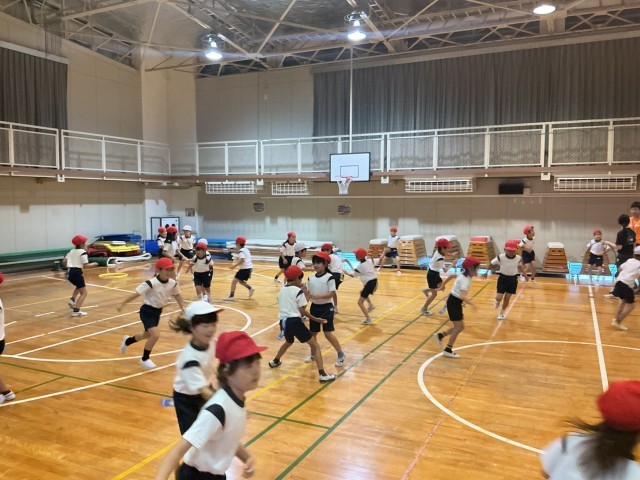 涼しい中丸ホールでは2年生が学年体育を行なっていました。クラス対抗で「しっぽ取り」に挑戦。2学期から転入してきた友だちともすっかりなじんでいます。
