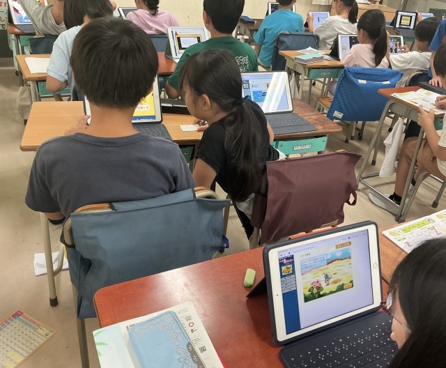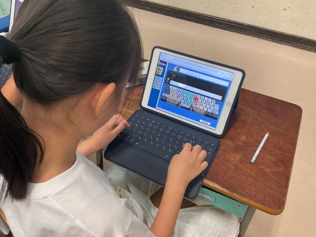 3年生教室では、ローマ字の学習に取り組んでいました。教科書や練習ドリルには、日本語の並びにならった日本人が読みやすい「訓令式」で載っていますが、今後は、パスポート表記でも使われている外国人も読みやすい「ヘボン式」に移行していきます。子どもたちはどちらの書き方も学んでいます。鉛筆でローマ字の書き取り練習に取り組んだ後、「キーボー島」というアプリを使ってローマ字入力、タイピングの練習にも取り組んでいました。担任の先生と同じくらい入力スピードが速い子もいて驚きました。